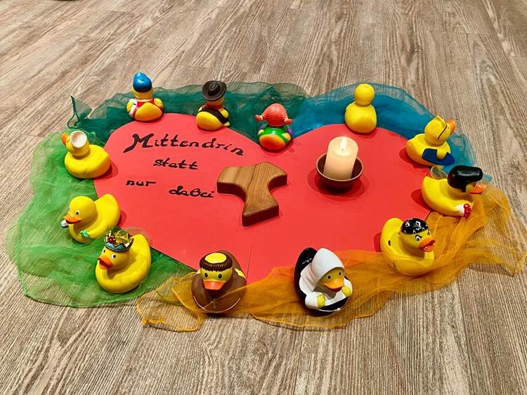 Abschließend feierten wir mit Br. Stefan Federbusch (ofm) einen Gottesdienst, bei dem Jesus in unserer Mitte gegenwärtig war und damit auch als mittendrin erfahrbar wurde. Die musikalische Gestaltung übernahmen die Teilnehmenden der Weggemeinschaft CleBoRa aus Malmsheim.